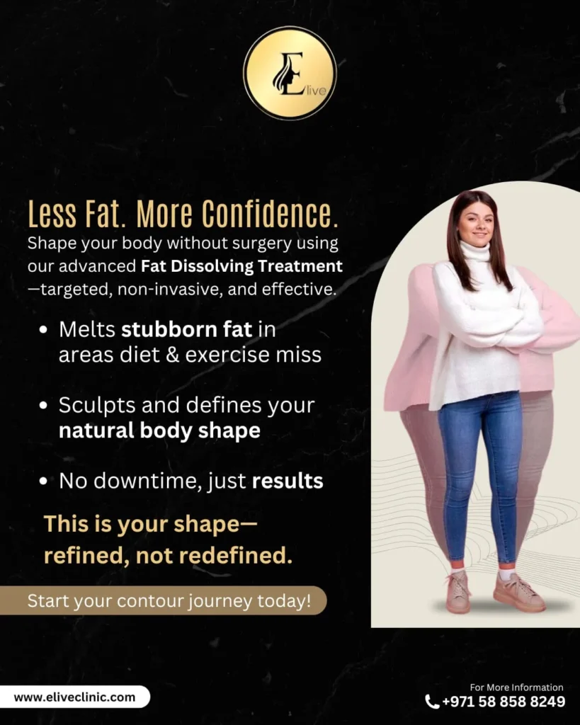 At Elive Clinics, Dubai, our advanced body contouring treatments are designed to help reshape and refine your body by targeting stubborn fat deposits and improving overall body definition. Using modern, non-surgical technologies, our certified specialists provide treatments that support gradual, natural-looking results with minimal disruption to your routine.